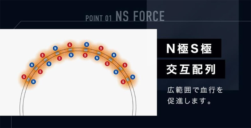 樹脂ループに50mTの永久磁石を8個配置し、首の前後と側面をバランスよく刺激する構造です。
